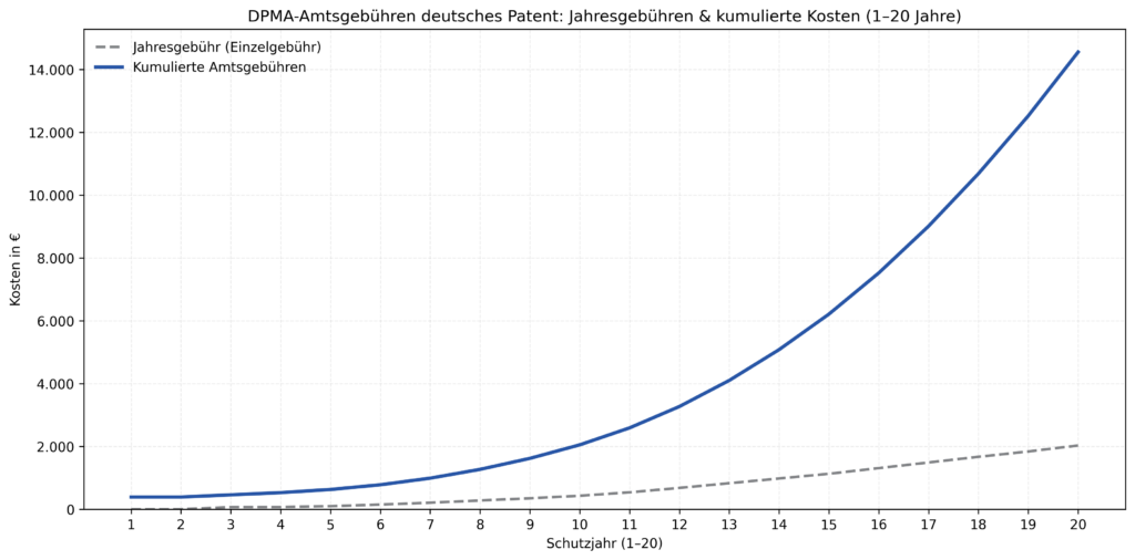 “What does a German patent application at the DPMA cost – and which official patent fees accrue over the maximum term of 20 years from the filing date?” This question frequently arises in practice when planning budgets for patent protection in Germany.
