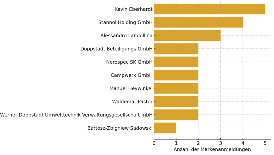 In 2024, companies and private individuals from Velbert filed numerous trademarks at both the national and European levels. In total, 57 trademarks were filed by 46 different applicants. The following overview shows the ten most active applicants from the city.