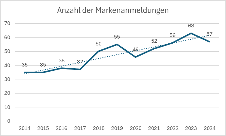 To put the current figures into context, we analyzed trademark filings by companies and private individuals from Velbert over the past ten years. Notably, unlike patents, trademark filings did not experience a pandemic-related decline. The stagnating economic situation in Germany also appears not to have had a negative impact on the figures. Instead, a clear upward trend can be observed: over the past ten years, the number of trademark filings has increased almost continuously and has nearly doubled since 2014.